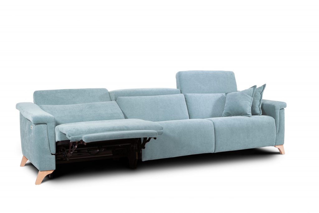 Sofá con mecanismo relax eléctrico el cual consta de un cabezal abatible en varias posiciones. La pata alta de madera hace que la limpieza debajo del sofá sea cómoda y un robot “Rumba” pueda pasar debajo de el sofá.